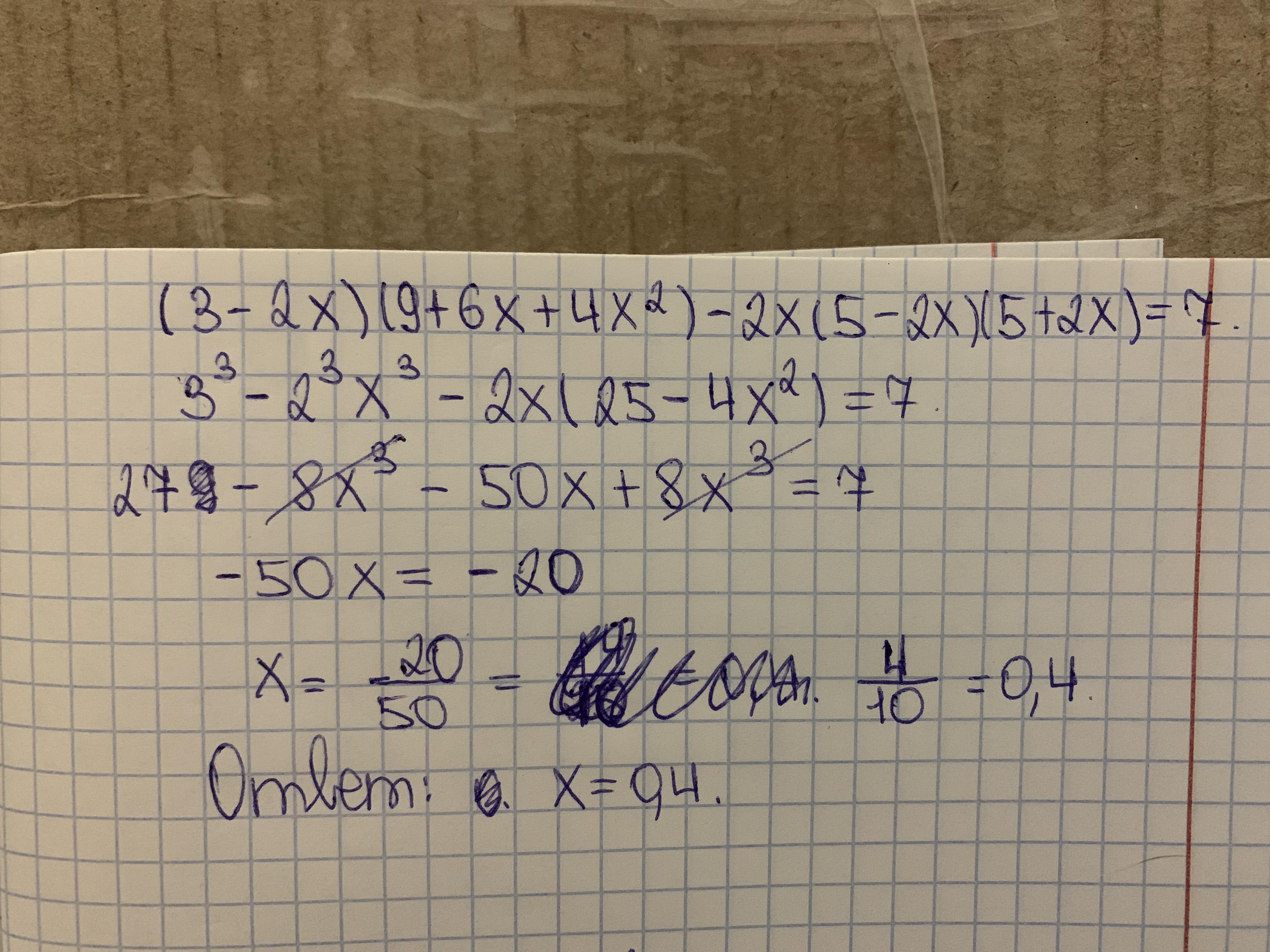 (3-2x) (9+6x+4x²)-2x (5-2x) (5+2x)=7
