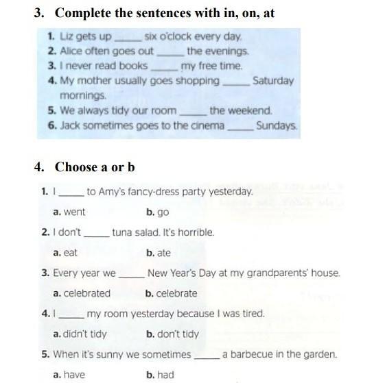 помогите пожалуйста (можно хотя-бы одно) в 3 (дополнить предложение in/on/at) в 4 (выбрать a или b)