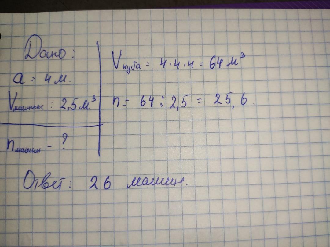 Экскаватор выкопал яму, имеющую форму куба с ребром 4 м. Сколько автомашин потребуется, чтобы вывести всю выкопанную землю, если одна машина вмещает в себя 2,5м3 земли?