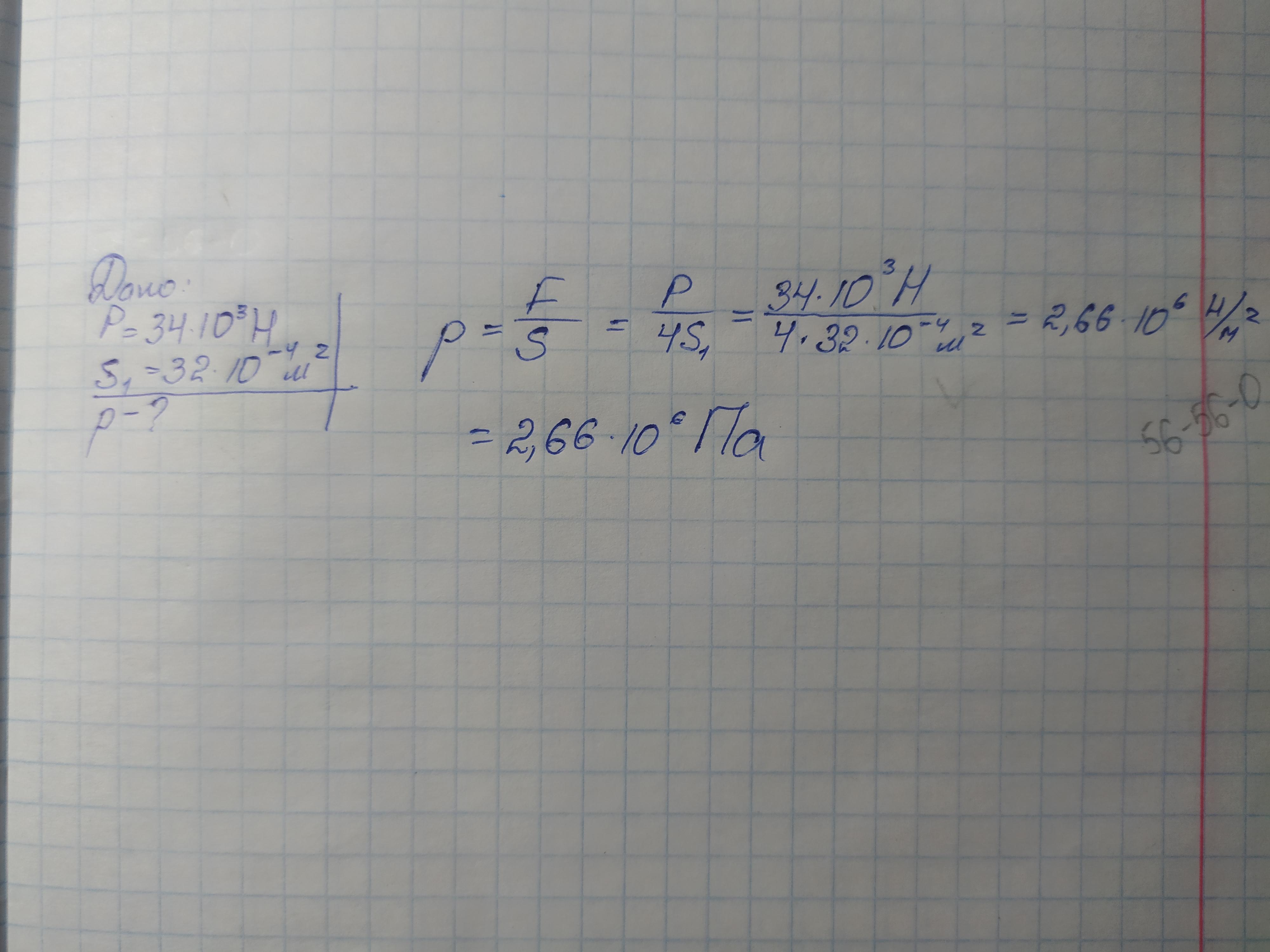 Вес легковой автомашины равен 34 кН. Площадь опоры каждого колеса равна 32 см2. Какое давление оказывает легковая автомашина на соответствующую поверхность?