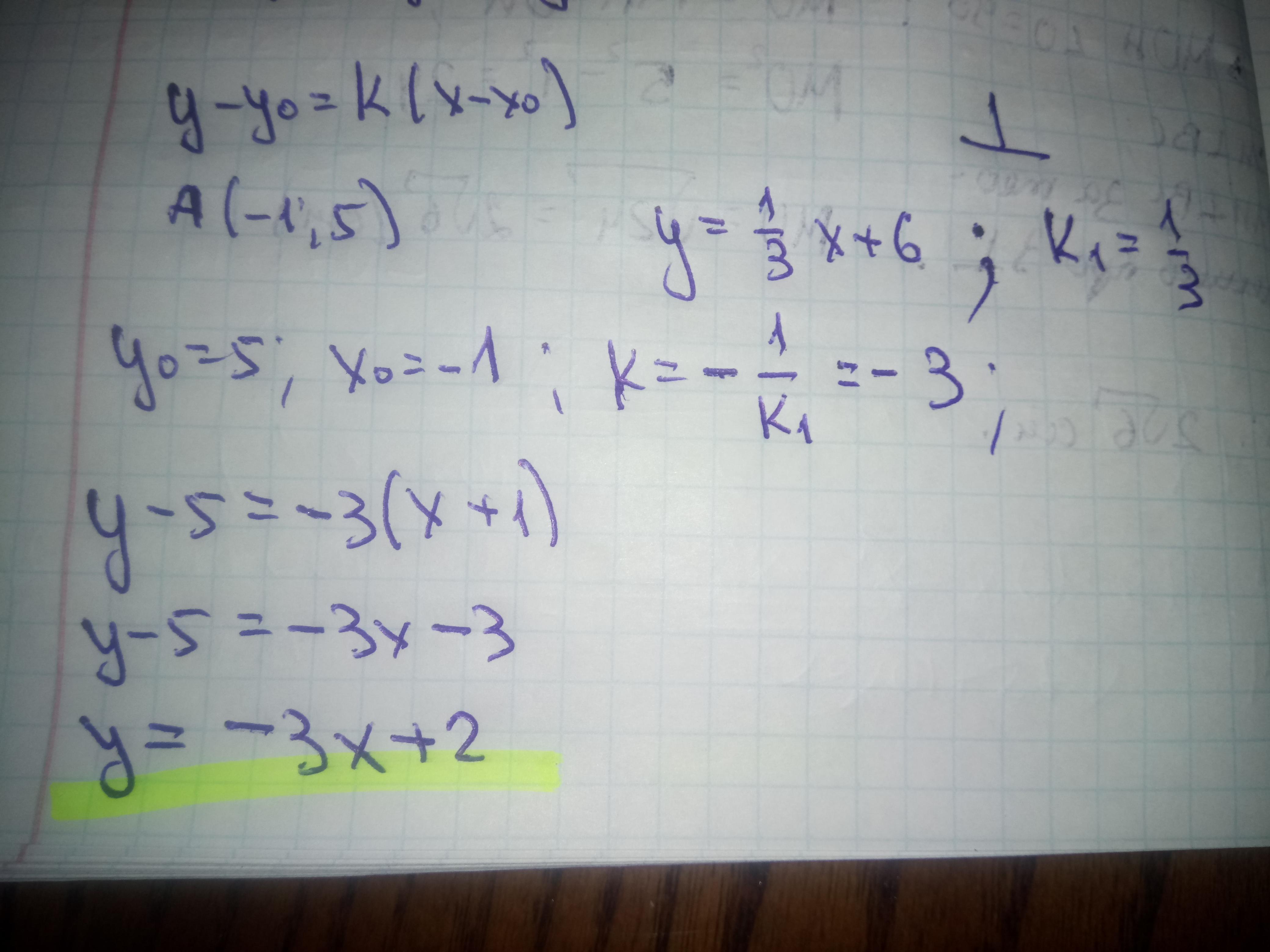 Написати рівняння прямої, що проходить через точку А(-1; 5) перпендикулярно прямій у =1/3 х + 6.