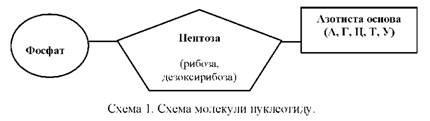 Нуклеотид состоит из азотистого основания, пятиуглеродного сахара (рибозы или дезоксирибозы) и остатка фосфорной кислоты (фосфата)