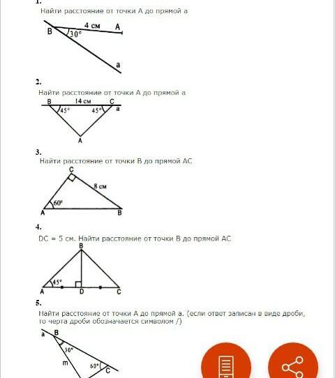 1)получаем прямоугольный треугольник. <B=30 градусов. Расстояние - это катет, лежащий против угла 30 градусов, он равен половине гипотенузы. Получаем 0,5*4=2. ;2). <А=90 градусов. Опускаем высоту в равнобедренном прямоугольном треугольнике. Она равна половине основания. Значит, расстояние до прямой равно 0,5*17=7.