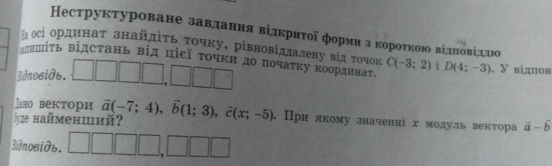 С(-3;2) и Д(4;-3) даны. Точка М лежащая на ординате имеет координату х=0, а координату у так и назовем - у. Тогда М(0;у). Она должна быть равноудалена от точек С и Д, то есть расстояние должно быть одно и то же.