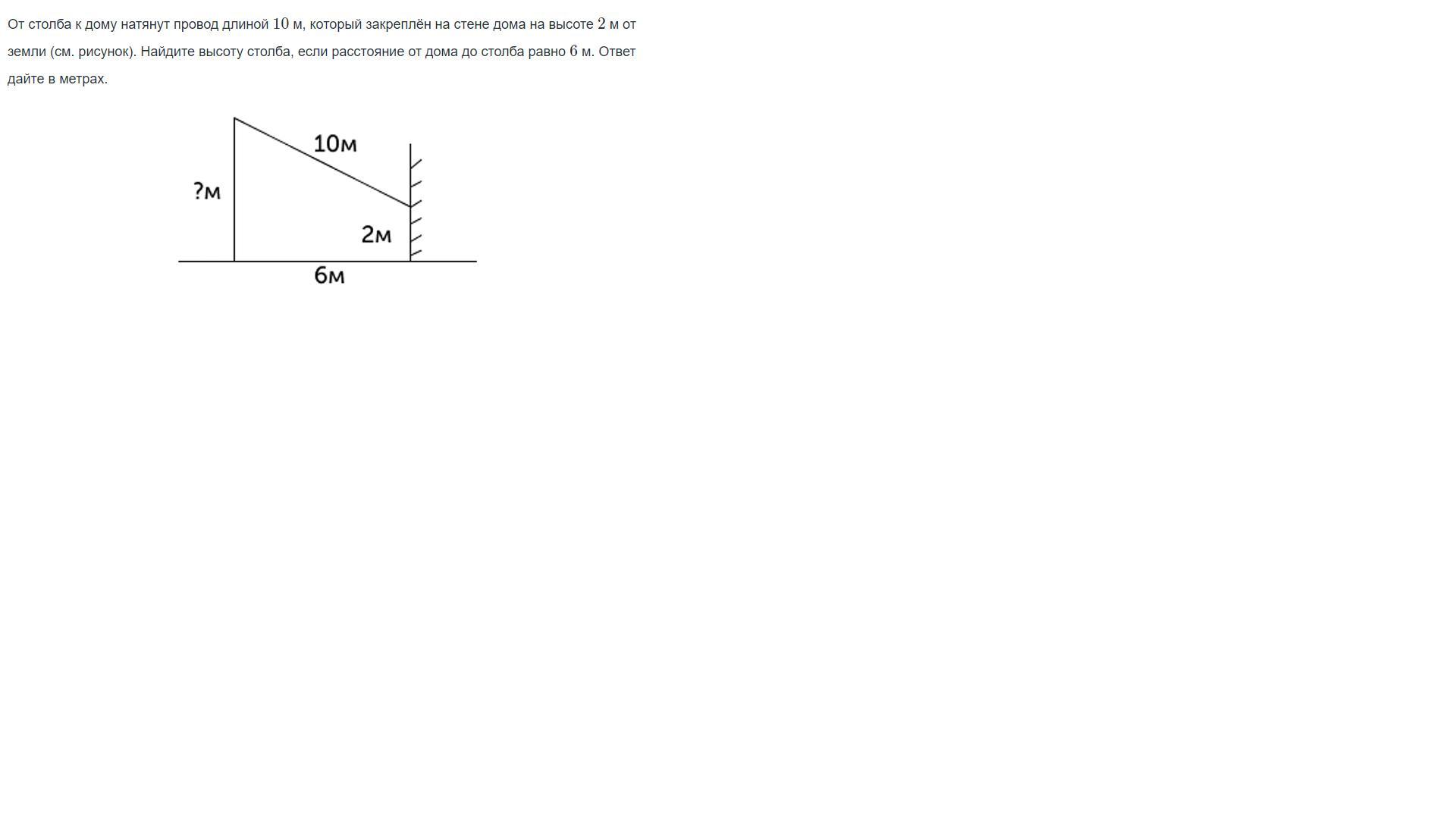 Неизвестная сторона трапеции разделится отрезком, параллельным стороне в 6 см на два, оин из них 2м, второй легко найти по теореме Пифагора из прямоугольного треугольника в котором один катет 6 м, гипотенуза 10м, значит, другой катет √(100-36)=8/м/, значит, высота столба равна 2+8=10 /м/