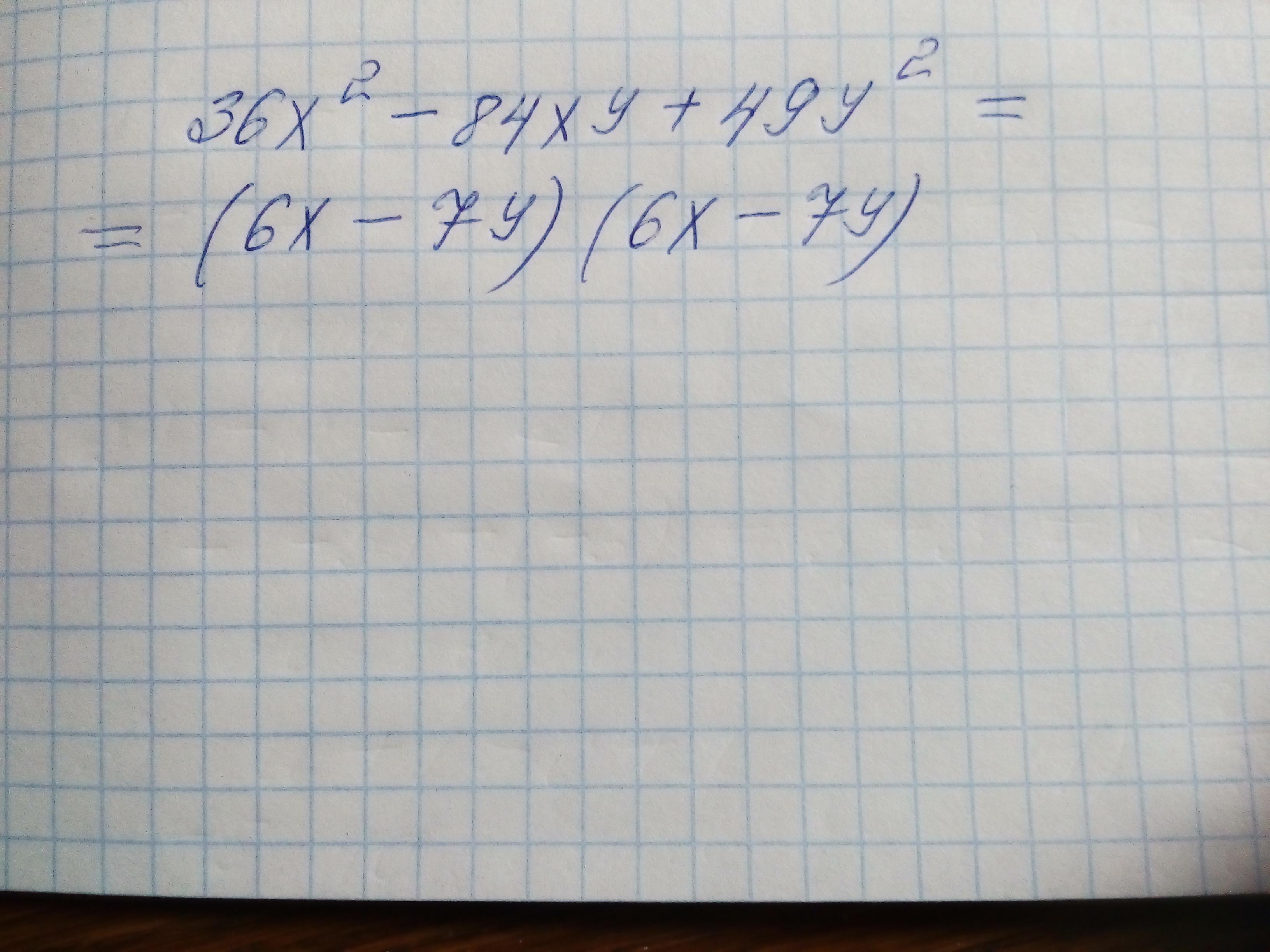 36х²-84ху+49у² = (6x)²-2·6x·7y+(7y)² = (6x-7y)² = (6x-7у)(6х-7у) - ответ.