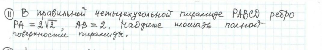 h=√( РA²-(AB/2)²). S боковой грани = 1/2·АВ·√( РA²-(AB/2)²). S основания= АВ². Учитывая, что граней 4, Sполной поверхности =