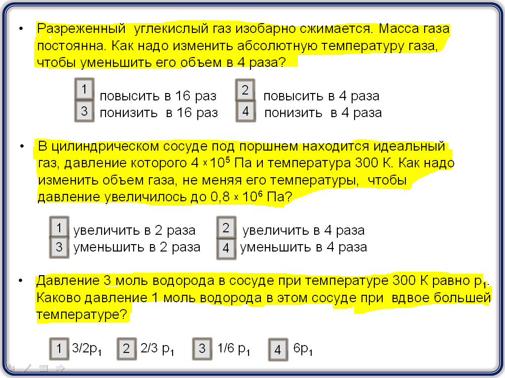 1. Разреженный углекислый газ изобарно сжимается. Масса газа постоянна. Как надо изменить абсолютную температуру газа, чтобы уменьшить его объем в 4 раза? 2. В цилиндрическом сосуде под поршнем находится идеальный газ, давление которого 4 х 105 Па и температура 300 К. Как надо изменить объем газа, не меняя его температуры, чтобы давление увеличилось до 0,8 х 106 Па? 3. Давление 3 моль водорода в сосуде при температуре 300 К равно р1. Каково давление 1 моль водорода в этом сосуде при вдвое большей температуре?