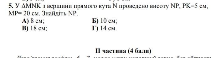 У трикутника MNK з вершини прямого кута проведено висоту NP, РК-5 см, MP- 20 см. Знайдіть NP.