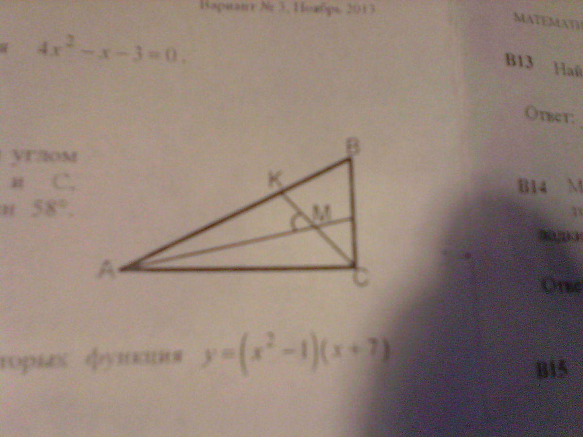 Найдем угол САМ. 180 - (122 + 45) = 13 45, потому что биссектриса из прямого угла. соотвественно, КАМ тоже 13, ибо биссектриса.