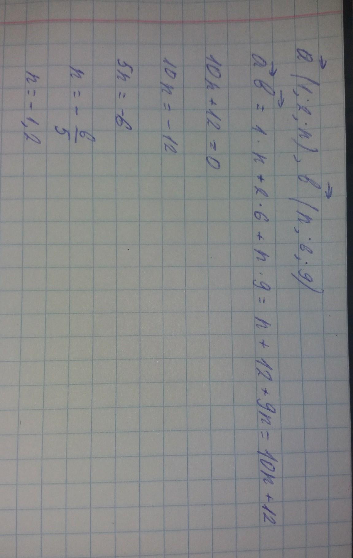 При каком значении n векторы а (1, 2, n) и b (n, 6, 9) перпендикулярны