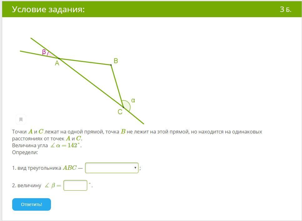 Вид треугольника - равносторонний, величина искомого угла - 38°
