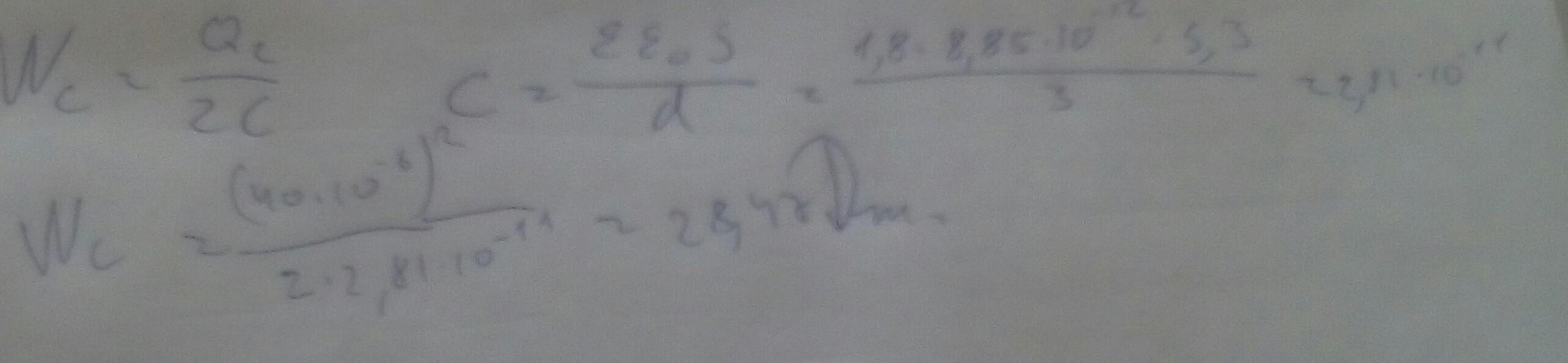 Заряд плоского конденсатора равен 40 мкКл, расстояние между пластинами 3 м, площадь пластин 5,3 м2, диэлектрическая проницаемость диэлектрика 1,8. Определите энергию конденсатора.