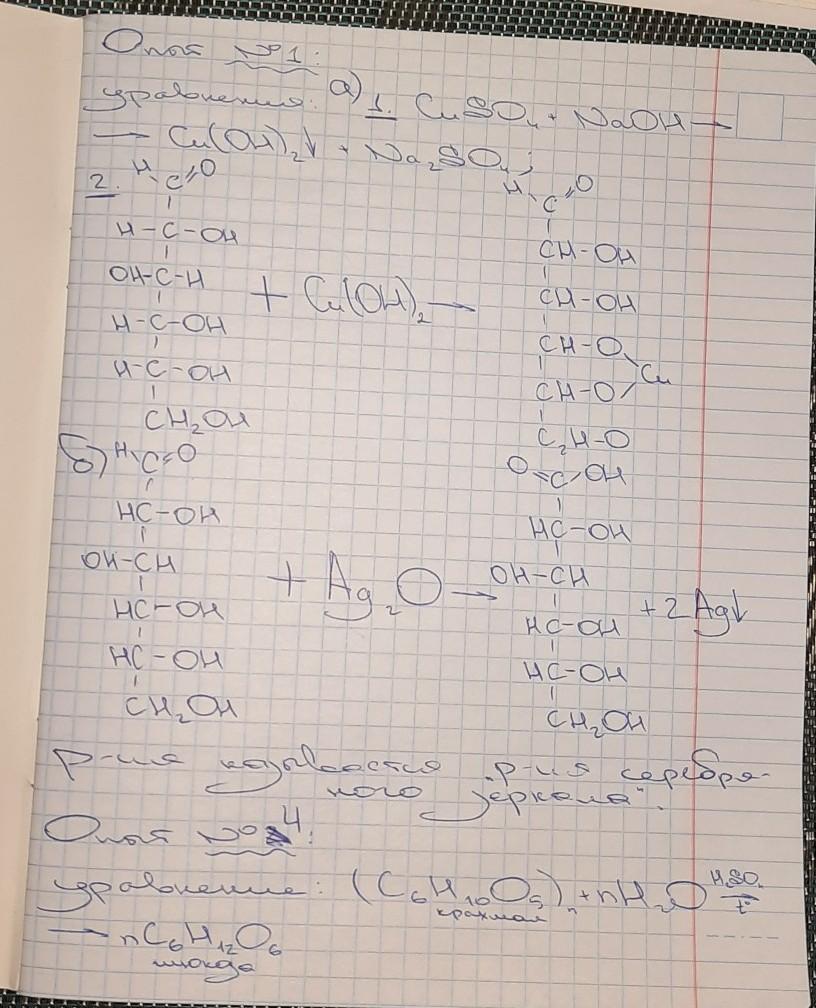 а) К 2–3мл раствора глюкозы добавьте 1 мл разбавленного раствора щелочи и 2–3 капли раствора сернокислой меди. Встряхните до растворения осадка и получения интенсивно синего цвета. Осторожно нагрейте до начала кипения, наблюдайте переход синей окраски в зеленую, в желтую, красную или коричневую образующегося осадка. Напишите уравнения реакций взаимодействия: