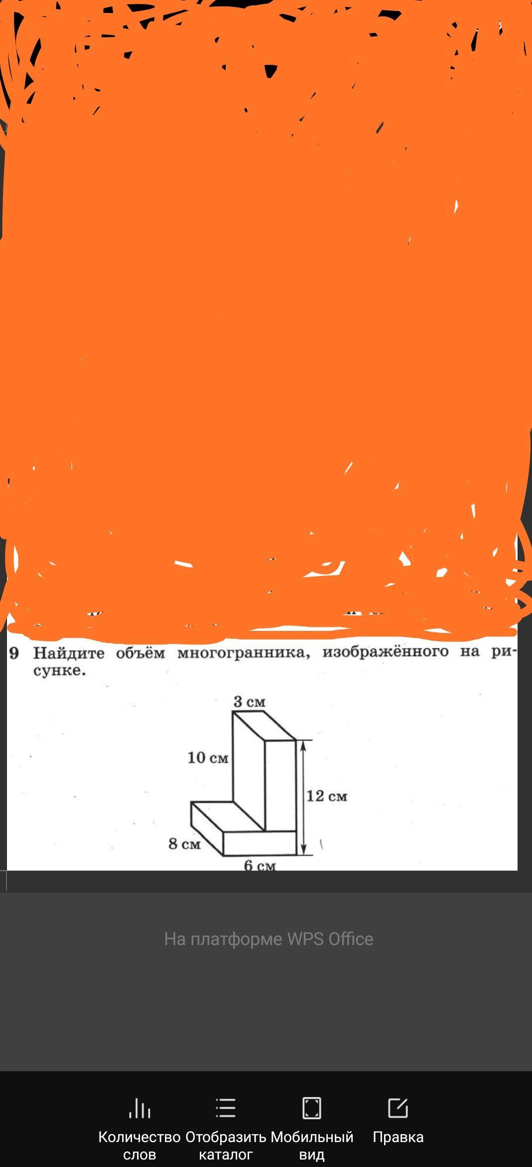 Найдем объем данного многогранника 576-240=336 (см3)