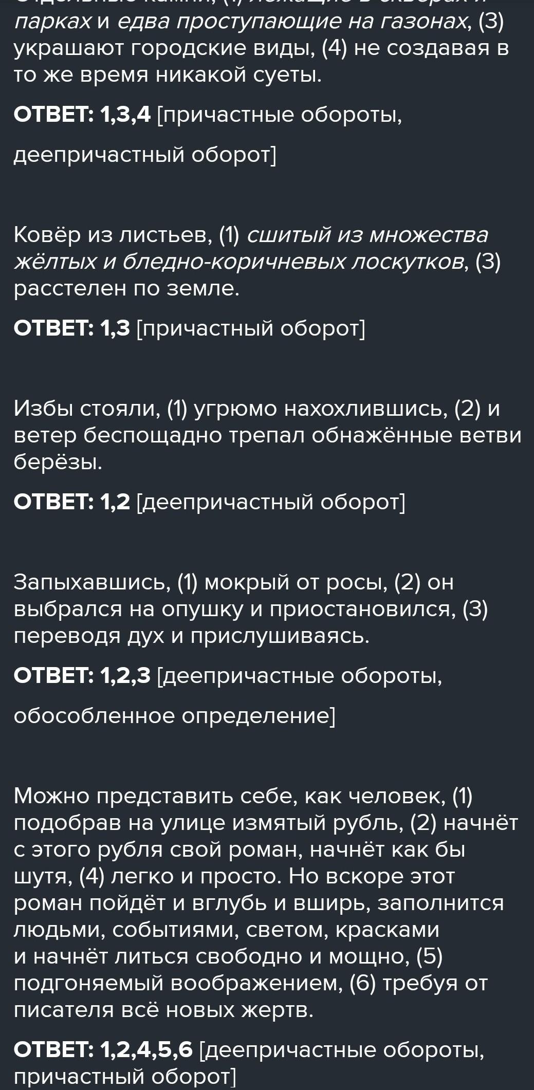 Укажите цифры, на месте которых должны стоять запятые. 1. Отдельные камни(1) лежащие в скверах и парках (2) и едва проступающие на газонах (3) украшают городские виды. 2.Ковёр из листьев(1)сшитый(2) из множества жёлтых и бледно-коричневых лоскутков(3) расстелен по земле. 3.Дешёвые фарфоровые безделушки на полочках и старинные литографии(1) симметрично развешенные по стенам(2)рассказывали (3) о новом увлечении хозяина дома. 4. Роса (1) выпадающая вечером(2)бывает очень обильной. 5.Это была (1) недавно расчищенная и неосвещённая(2) поляна (3) и на ней стоял новый дом. 6.Он заставлял меня смотреть и на море(1)сизой тучей лежавшее внизу(2) и на последний жёлтый цветок(3) выросший на каменистой дороге(4) и на далёкий водопад(5) казавшийся издали прядью(6)брошенных на отвесные скалы нитей. 7.Под коркой льда(1) ставшей прозрачной под лучами весеннего солнца (2) журчит(3) пробивающий дорогу к косогору(4)ручей. 8.Они остановились на краю(1) заполненного серым туманом(2) гигантского провала. Где-то вдали мерещился другой берег(3) напоминающий прильнувшие к земле тяжёлые облака. 9.Старый пароход напоминал(1) начищенный кирпичом до яркого блеска(2)дымящийся самовар(4) болтающийся на невысоких волнах мелкого моря. 10.Мы видим деревенского кота, который украл рыбу(1)называемую плотицей(2( и пойманную соседским мальчишкой(3) и уносит её в зубах. 11.Мы выбрались на поляну(1) сплошь покрытую пнями(2)поросшими мохом (3) и ковром (4) пестревших цветов.