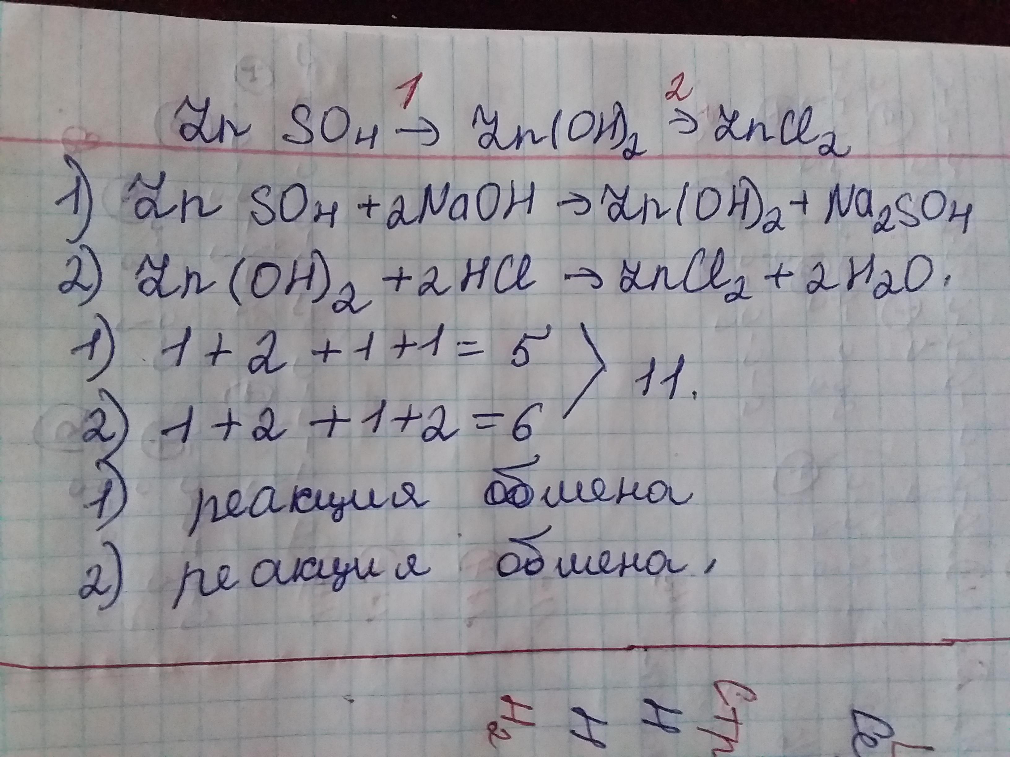 Здійснити перетворення: ZnSO4 ⇄ Zn(OH)2 ⇄ ZnCl2. Указати тип реакцій, та порахувати суму коефіцієнтів до кожного рівняння реакції й указати загальну суму коефіцієнтів