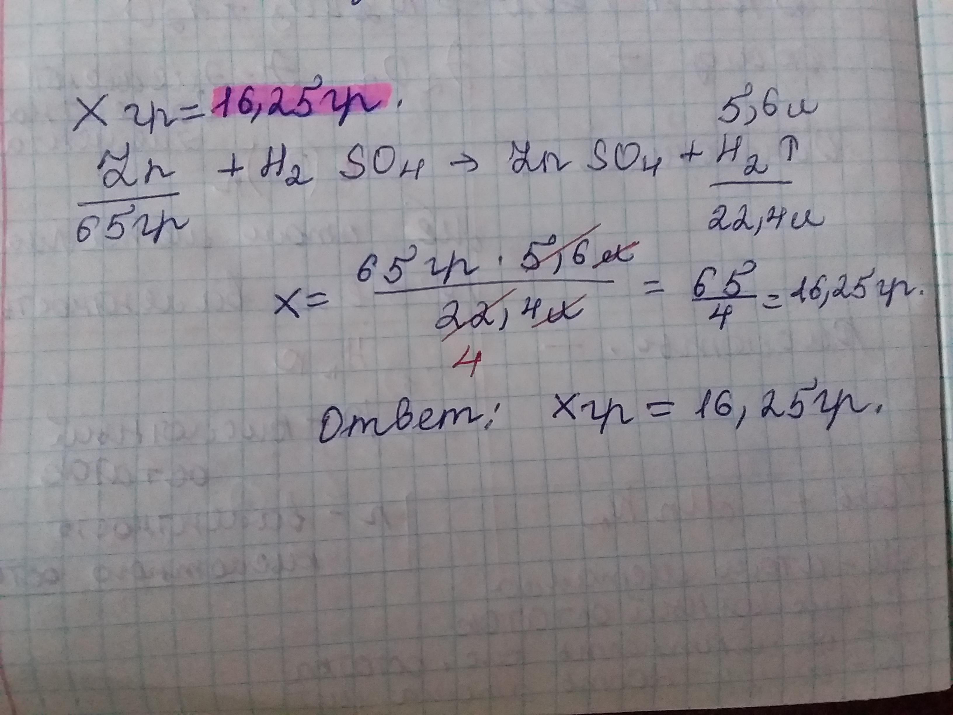 Вычислите, сколько грамм цинка вступило в реакцию с серной кислотой, если получено 5,6 л водорода? С Дано и решением