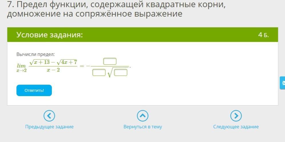 Бояться этой суммы корней в знаменателе не стоит, просто продолжим упрощать выражение насколько возможно, а затем просто подставим число, к которому стремится предел. И получится ответ, идеально подходящий к имеющемуся у вас шаблону.