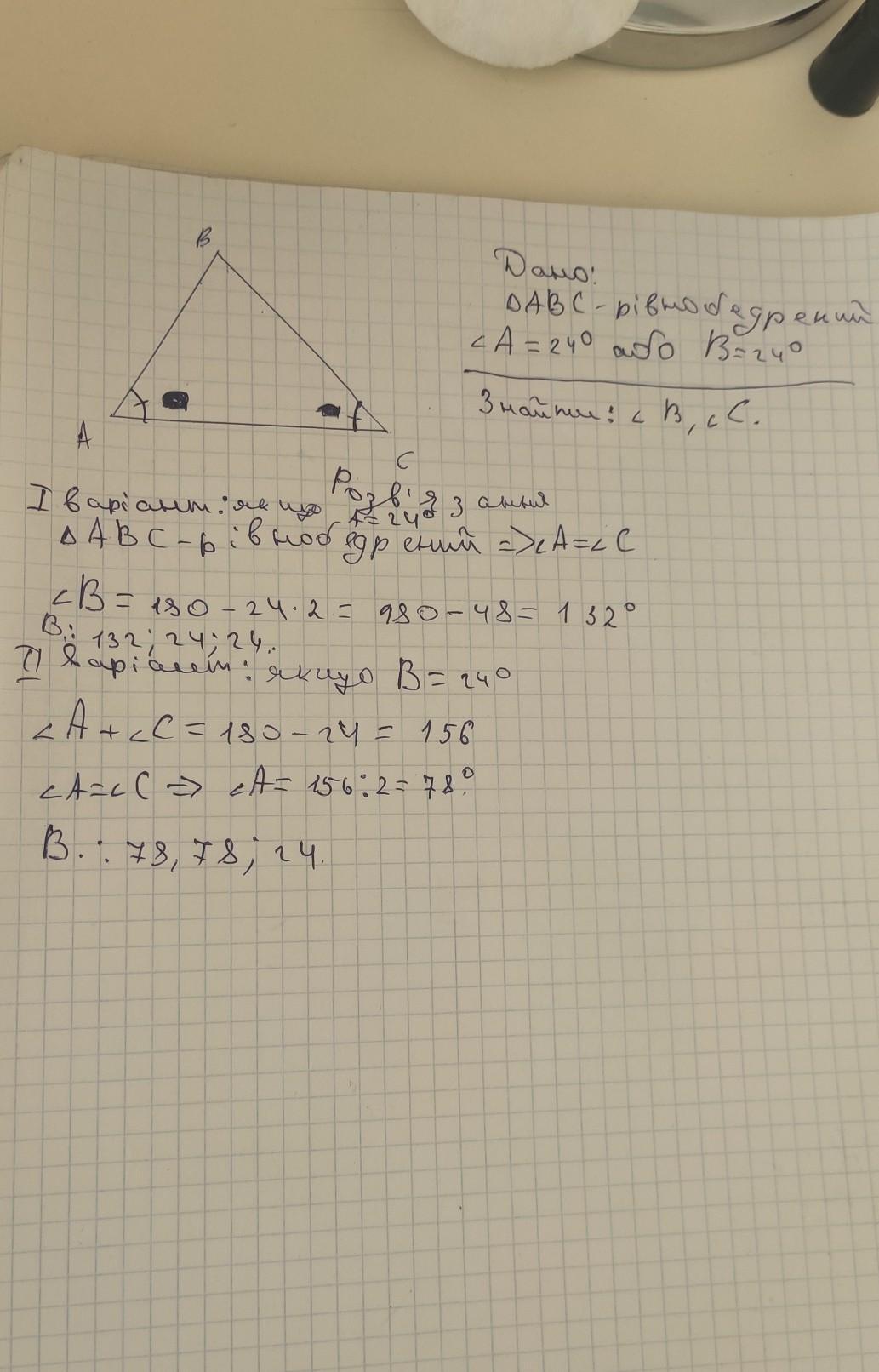 ПОМОГИТЕ ОЧЕНЬ СРОЧНО Один із кутів рівнобедреного трикутника на 24° більший за інший. Знайдіть кути трикутника.