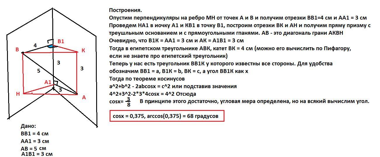 В дорівнює 5 см, а між їхніми проекціями на ребро кута – 3 см.