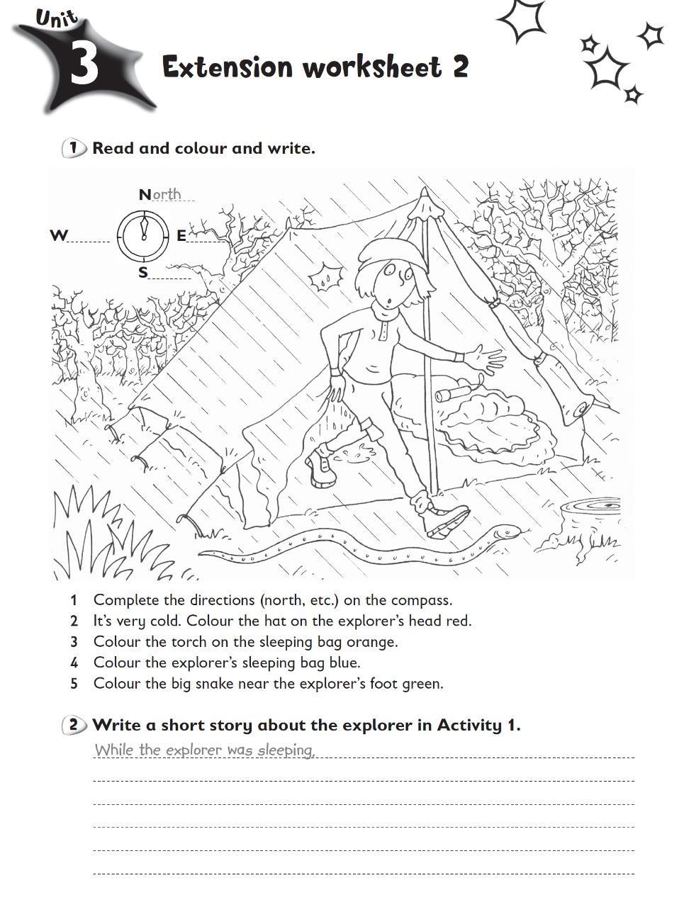 While the explorer was sleeping a heavy rain stated. The explorer jumped out of the tent in fright, and saw that her tent would soon collapse! Oh, no! She ran around looking for sticks to prop up the tent. Suddenly a snake crept by. The explorer stopped in her tracks. Oh, no she whispered... What CAN I do? Then she slowly stepped back reached behind her. She felt a stone and grabbed it. She threw it at the snake! The explorer hit the snake right in the middle. The snake hissed and slithered away. Then the rain suddenly stopped. Hooray! the explorer said. I'm saved! Then she carefully fixed the tent and went bavk inside.
