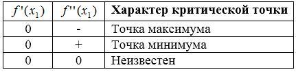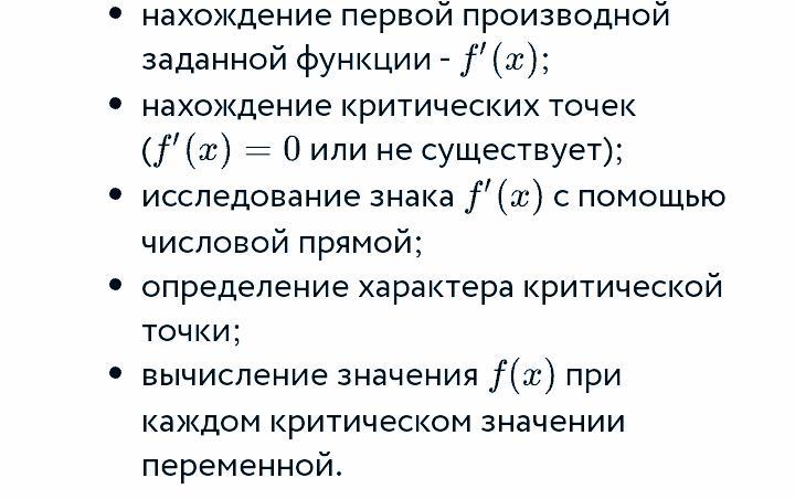 Алгоритм исследования с помощью второй производной на максимум и минимум включает следующие этапы: 1)нахождение первой производной заданной функции - f′(x); 2) нахождение критических точек (f′(x)=0 или не существует); 3)нахождение второй производной заданной функции - f″(x); 4)исследование знака f″(x) в критической точке; 5)определение характера критической точки; 6)вычисление значения f(x) при каждом критическом значении переменной.