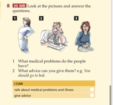 во втором задании 1-backache 2-headache or tired 3-abdominal pain