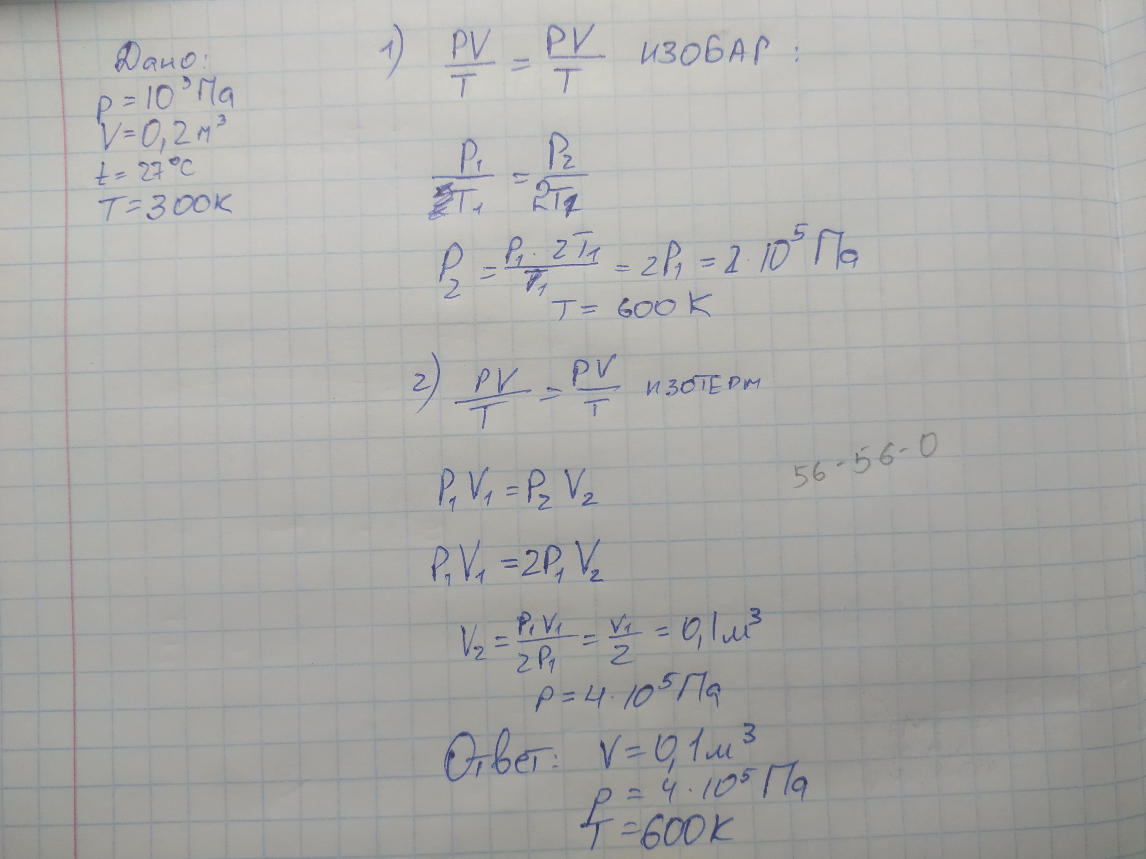 увеличивается в 2 раза. Определите конечные параметры состояния газа: давление,