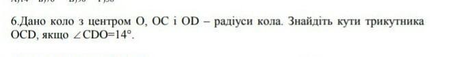 Дано коло з центром О, ОС і ОД радіуси кола. Знайдіть кути трикутника ОСД, якщо кут СДО=14