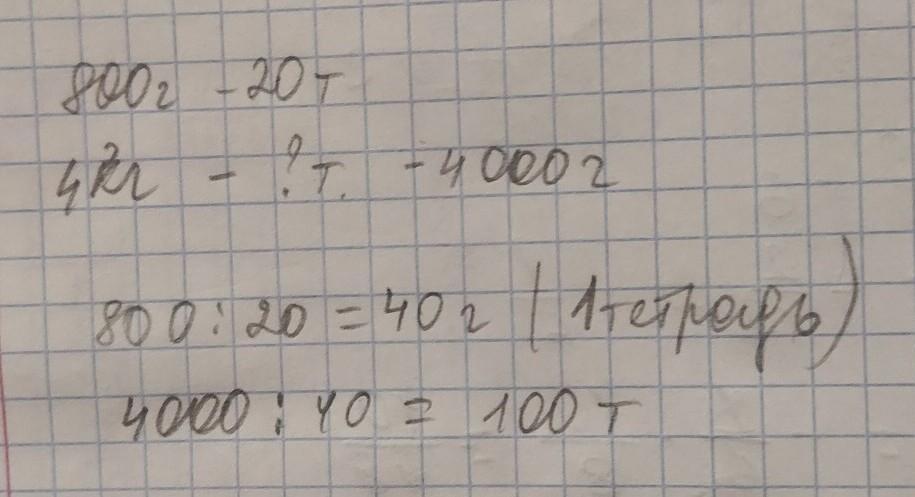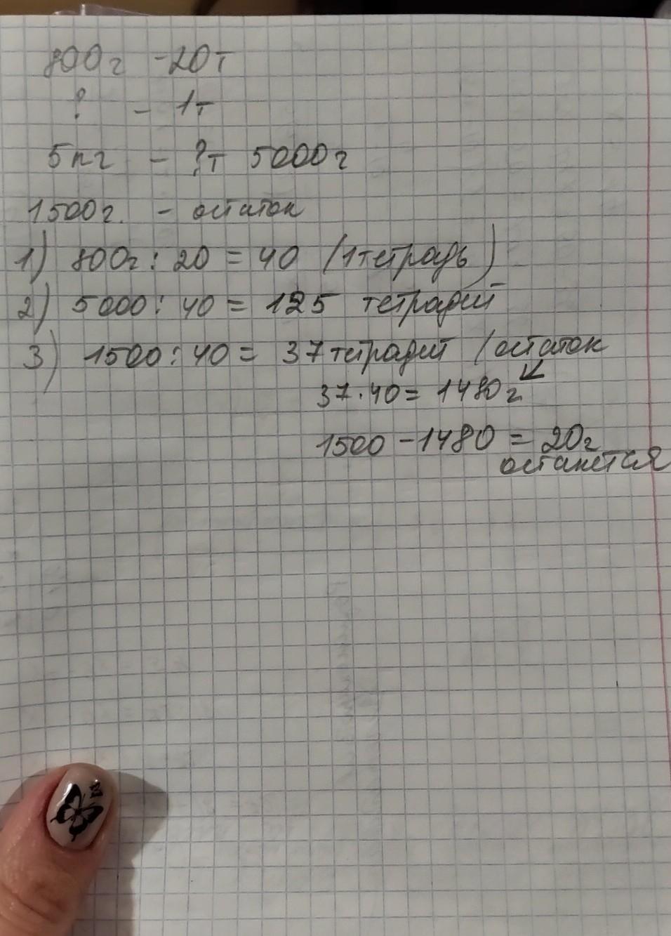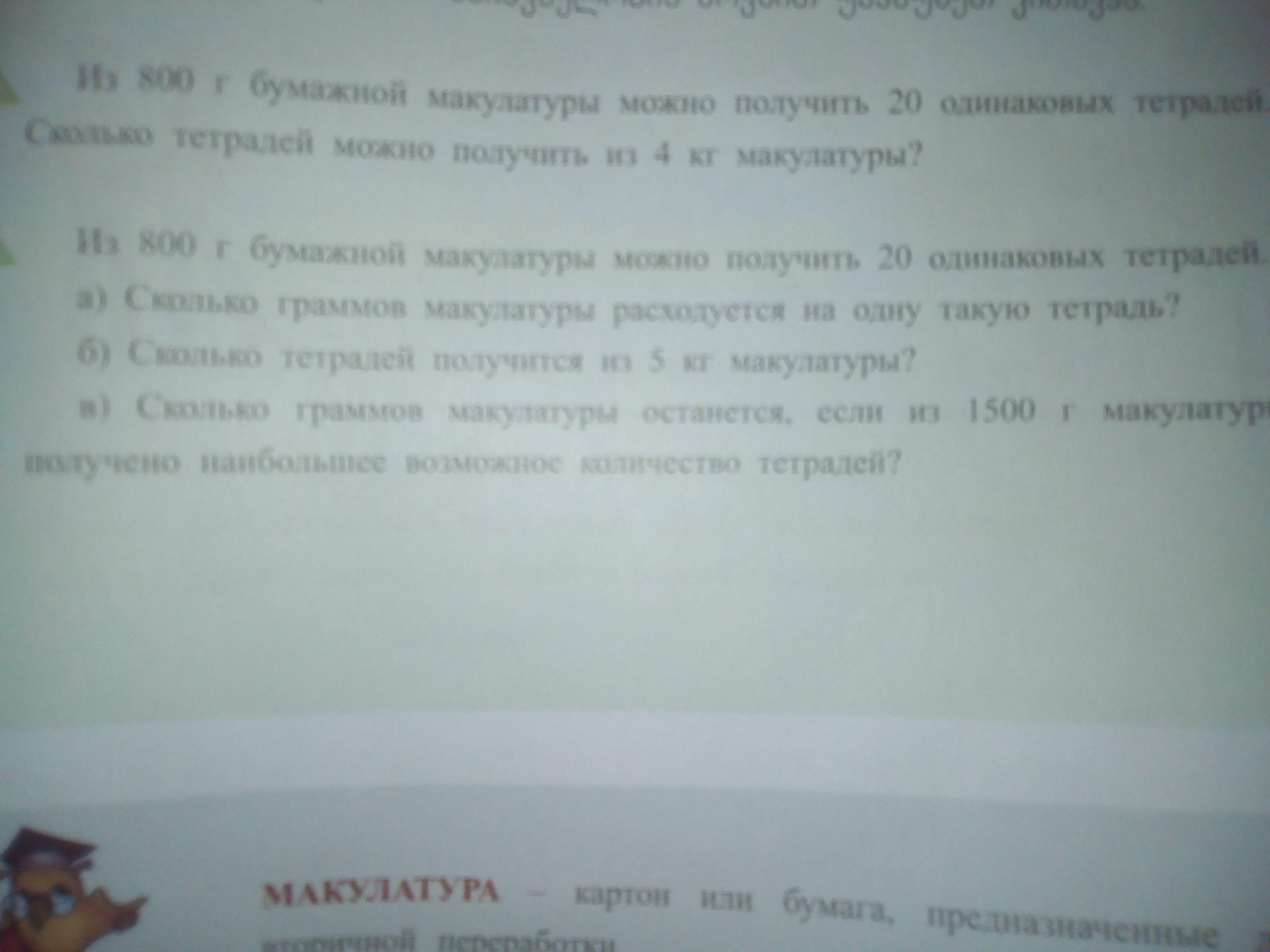 1) 800÷20= 40 г -столько граммов макулатуры используется для изготовления 1 тетради.