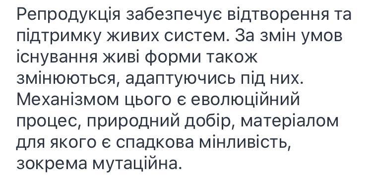Репродукція забезпечує відтворення та підтримку живих систем. Проте не треба розуміти цей процес лише як копіювання наявних форм. За змін умов існування живі форми також змінюються, адаптуючись під них. Механізмом цього є природний добір, матеріалом для якого є спадкова мінливість, зокрема мутаційна. Шляхом накопичення з покоління в покоління змін організми можуть стати настільки відмінними від вихідної форми, що ми починаємо розглядати їх як різні види. Такі зміни відбуваються дуже поступово, їх можна побачити лише на великих часових проміжках (рис. 206). Варто наголосити, що не існує дискретних моментів, коли один вид перестає бути ним і стає іншим. Учені детально дослідили становлення багатьох груп організмів, зокрема і нашого біологічного виду - Людина розумна, що ви вивчали у минулому році. Зібравши разом наявні відомості про еволюційні зміни, науковці здатні реконструювати процес поступових змін живих форм - від сучасних форм до спільних предків різних груп, ніби «прокручуючи назад» еволюційний процес, спостерігаючи процес переходу одних видів у інші в оберненому напрямку. У результаті такого аналізу сформовано уявлення про останнього універсального спільного предка сучасних організмів, який існував 3,5-3,8 млрд років тому.