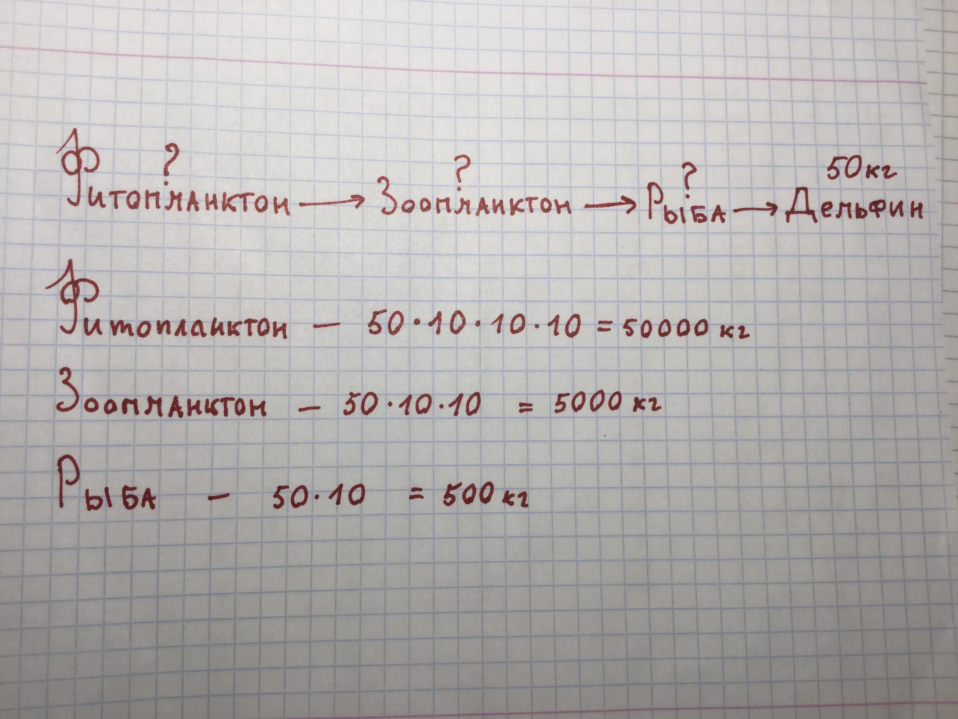 Масса дельфина 50 кг. Пусть только 10% энергии пищи переходит во вновь построенное вещество организма, а 90% расходуется на различные процессы жизнедеятельности. Определите массу съеденной дельфином рыбы, массу зоопланктона и фитопланктона в данной пищевой цепи. Поясните свой ответ.
