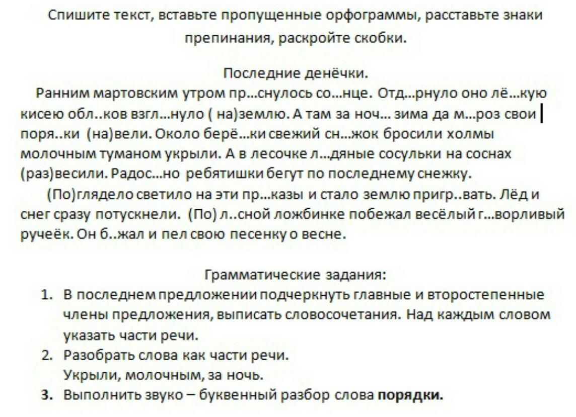 Объяснение: Ранним мартовским утром проснулось солнце. Отдёрнуло оно лёгкую кисею облаков взглянуло на землю. А там за ночь зима да мороз свои порядки навели. Около берёзки свежий снежок бросили холмы молочным туманом укрыли. А в лесочке ледяные сосульки на соснах развесились. Радостно ребятишки бегут поп последнему снежку.