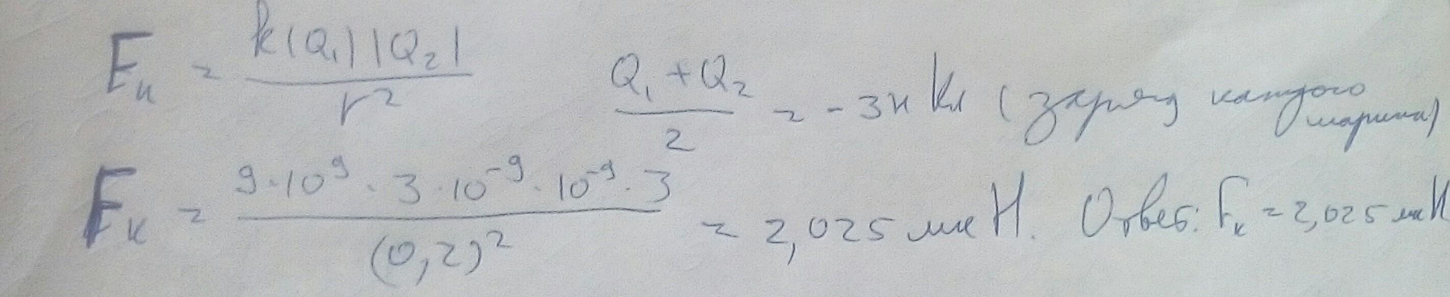 F = (9*10⁹ Н м²/кл²)* 1*10⁻⁹ кл* 7*10⁻⁹кл/(0,2² м²)= (63*10⁻⁹ / 0,04) Н= 1575*10⁻⁹ /H /=1.575*10⁻⁶Н