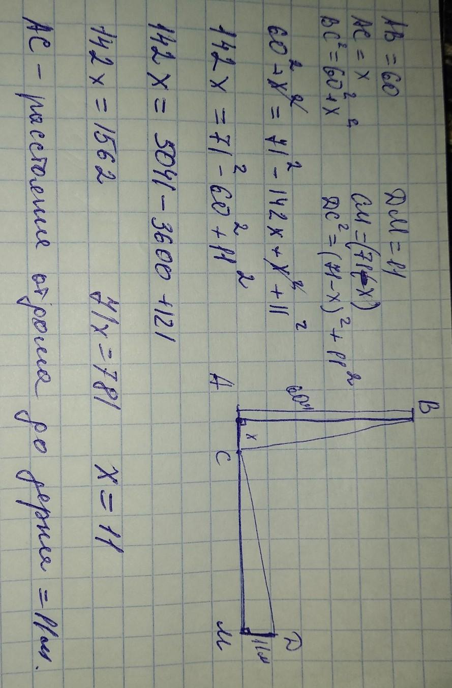 Определи, на каком расстоянии от дома Лариса рассыпала зерно, если известно, что высота дома равна 60 м, высота фонаря — 11 м. Фонарь находится от дома на расстоянии 71 м.