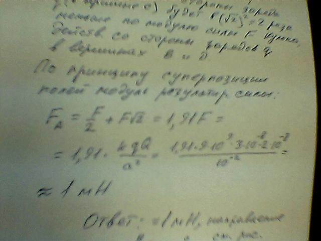 В трех вершинах квадрата со стороной 10 см находятся одинаковые точечные положительные заряды по 3-10_8Кл. С какой силой будут действовать эти заряды на положительный точечный электрический заряд 2»10-8Кл, расположенный в четвертой вершине квадрата?
