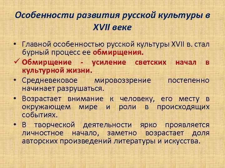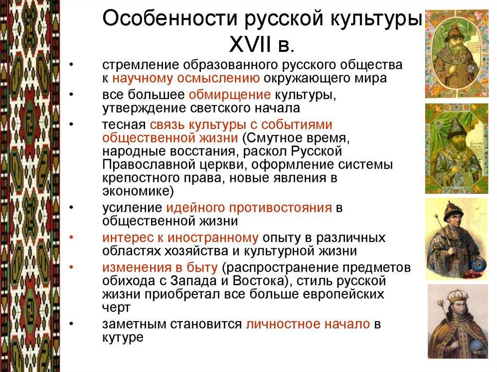 ХVII в., являясь периодом быстрого развития древнерусской культуры, в то же время был веком ее завершения. Сохраняя основные черты традиционного уклада, русское общество начинает трансформироваться в направлении, которое в последствии найдет свое наивысшее выражение в реформах Петра Великого. Россия стояла на пороге нового времени. В культуре отчетливо выделяются две тенденции: проникновение западноевропейских влияний и прогрессирующий процесс обмирщения (секуляризации), т.е. освобождения от господства церкви. Развитие товарного производства, начало формирования всероссийского рынка обусловили возникновение в недрах феодально-крепостнического строя первых ростков буржуазных общественных отношений, что позволяет считать XVII век началом нового периода русской истории. Культурный процесс в XVII веке становится более светским. Началось ослабление традиционного средневекового религиозного мировоззрения. Возникло представление о самоценности жизни с ее радостями и горестями. Такие взгляды стали проявляться в литературе, искусстве, в общественной мысли. В свою очередь, церковь пресекала всякие проявления инакомыслия. Эта борьба характерна для XVII века. В литературе проходило ее «обмирщение», т.е. она повернулась к реальному миру и мир повернулся к ней. Не только историческим источником, но и памятником литературы, высоко ценимым Л.Н. Толстым, стало «Житие» протопопа Аввакума, написанное им в ссылке и опубликованное в 1861 г. Оставаясь глубоко религиозным христианином, Аввакум обратился к жанру «Жития», основал новое направление, автобиографии-исповеди. Образный язык, обличение несправедливости, в том числе церковной, уважение к человеку, описание своих личных страданий «во имя веры» не могли никого оставить равнодушным. Как писатель Аввакум обладал замечательным даром слова, он был проповедником, признанным русской литературой. В XVII веке в литературе возникает сатирическая литература. Она нередко базировалась на устном народном творчестве. Известность получили «Повести о Шемякином суде» и «Повести о Ерше Ершовиче», обличавшие порядки феодального суда. Выражение « шемякин суд» вошло в поговорку. Объектом сатиры временами становилась даже церковь, ее отступление от проповедуемых истин. Конкретных авторов нет, но создаются произведения «демократической сатиры». Как известно, православие считало смех греховным. Ирония сатирических произведений направлена на определенный объект. Вера и православие в смеховой литературе не затрагивались, но недостойные служители церкви осмеивались в «смехотворных укоризнах». В XVII столетии русская культура достигла больших успехов в развитии архитектуры, иконописи и даже появился первый советский жанр – написание портретов. Православное христианство и образование централизованного Российского государства способствовали развитию культурного процесса. В XVII веке завершается эволюция средневековой культуры. Формируется политическая концепция самодержавия, как формы правления в централизованном государстве, преодолевшем удельную раздробленность, проявляются реальные признаки развития светской культуры, потеснившей господство религиозной традиции.