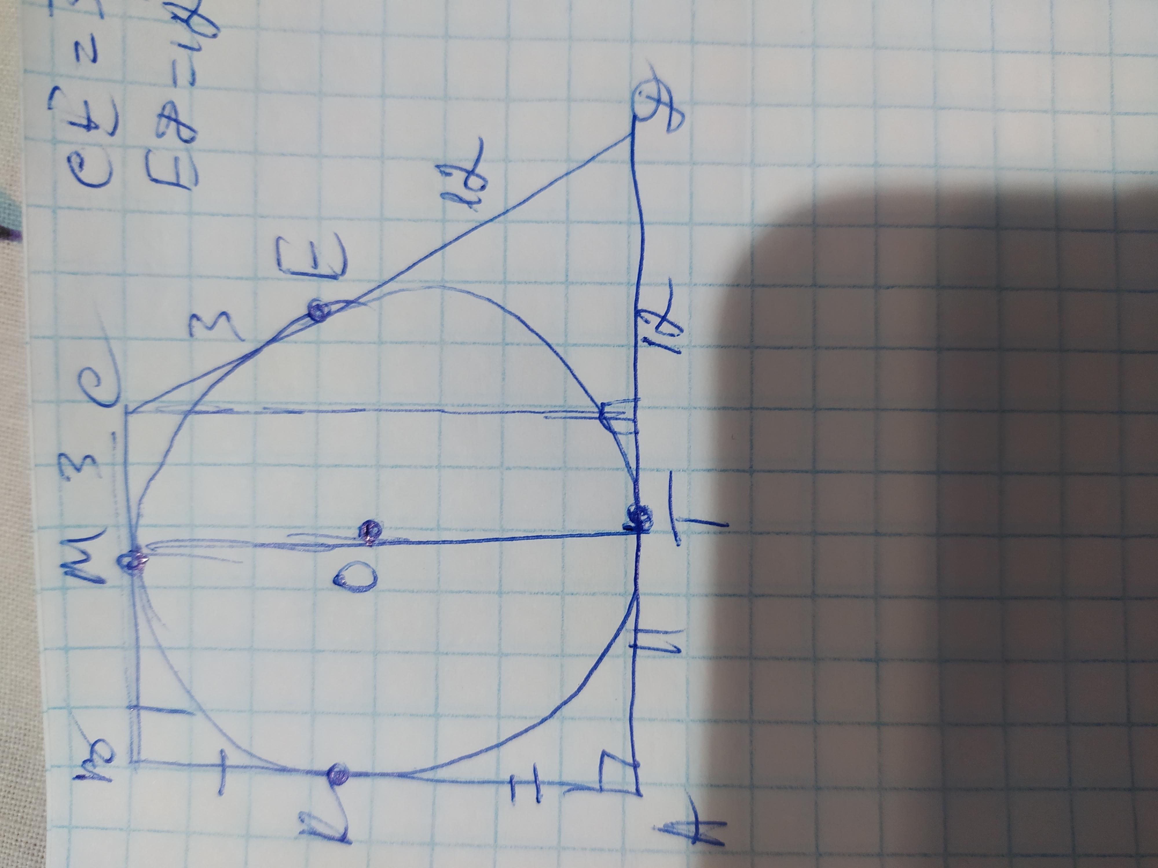 Объяснение: Обозначим вершины трапеции А В С Д, точки касания К М Е Т,ма центр окружности О. Стороны трапеции являются касательными к вписанной окружности поэтому отрезки касательных соединяясь в одной вершине равны от вершины до точки касания. Поэтому АК=ВМ, МС=СЕ, ЕД=ДТ, АК=АТ. Проведём из вершины С высоту ВН к основанию АД. Она делит нижнее основание так что АН= ВС. Проведём через центр окружности диаметр МТ. Получился прямоугольник, в котором МС=ТН=3см. Так как ТД=ЕД=12см, то ДН=ТД-ТН=12-3=9см. ДН=9см. Рассмотрим полученный ∆СДН. Он прямоугольный. В нём СН и ДН являются катетами а СД - гипотенузой. СД=СЕ+ЕД=3+12=15см Найдём катет СН по теореме Пифагора: СН²=СД²-ДН²=
