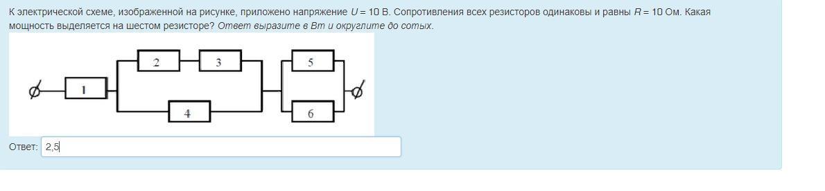В электрической цепи изображенной на рисунке приложено напряжение U=10В сопротивление резисторов одинаковое 10 Ом какая мощьность выделится на 6 резисторе ссылка на рисунок