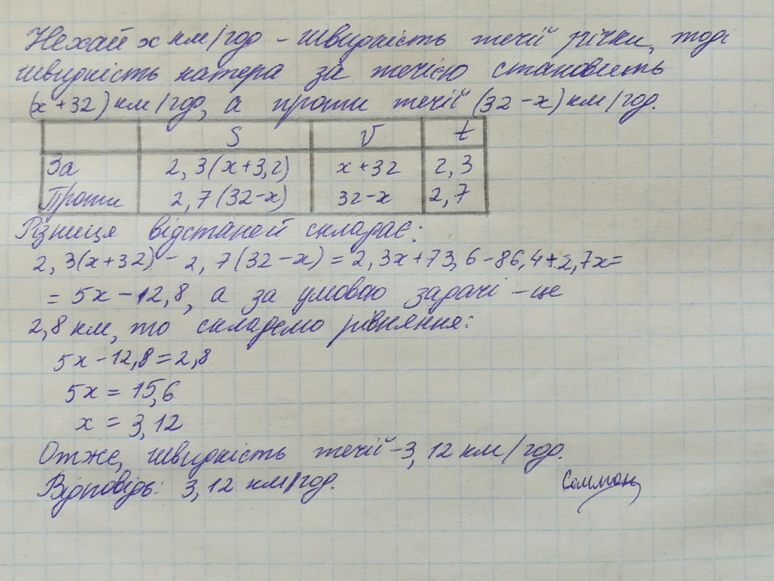 Катер плив за течіею річки 2,3 год і проти течії- 2,7 год. Шлях, який катер пройшов за течіею, на 2,8 км довший, ніж шлях, який пройшов катер за течіею. Знайдіть швидкість течії, якщо власна швидкість катера стано- вить 32 км/го
