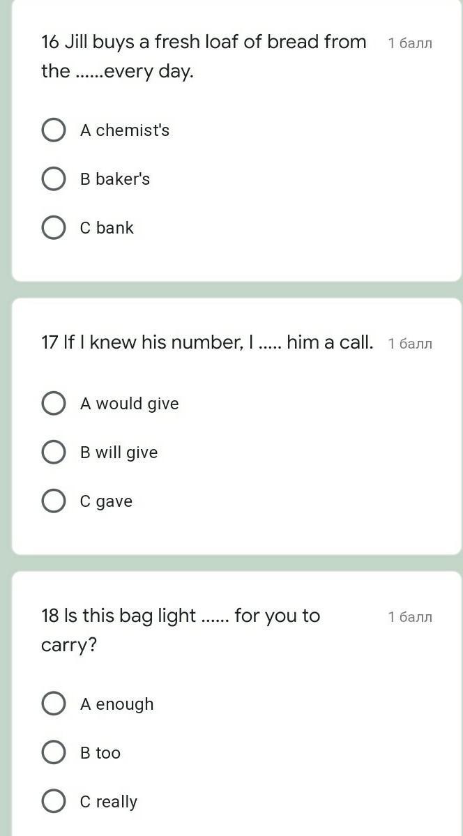 16. Jill buys a fresh loaf of bread from the baker's (B) every day. (chemist's=аптека, bank=банк)
