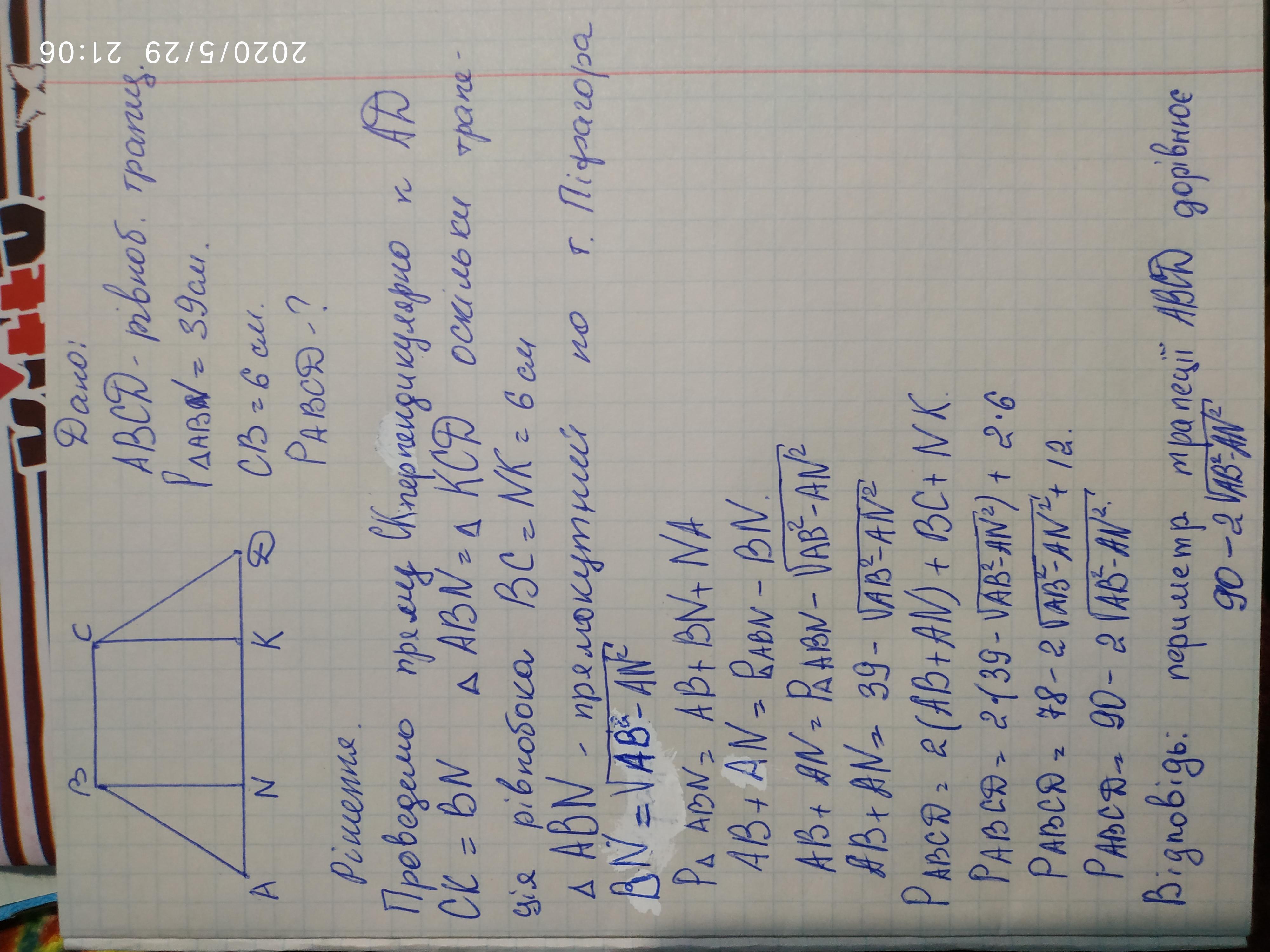Равсд=2(39-√(АВ²-АN²)+2*6