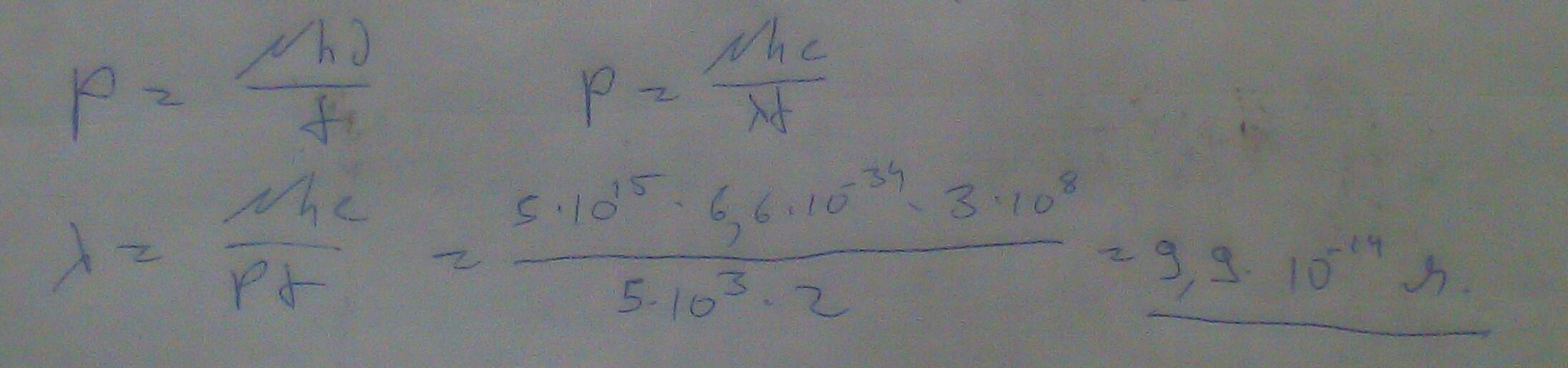 Найти длину волны излучения источника света мощностью 5кВТ, излучающего за 2 секунды 5⋅10^15 фотонов.