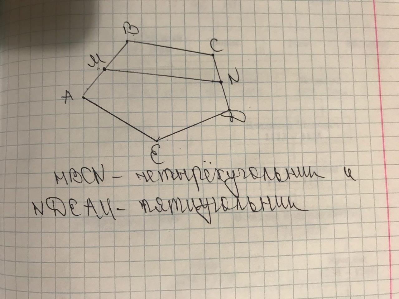 Начерти пятиугольник ABCDE. Отметь точку м на стороне AB и точку N на стороне
