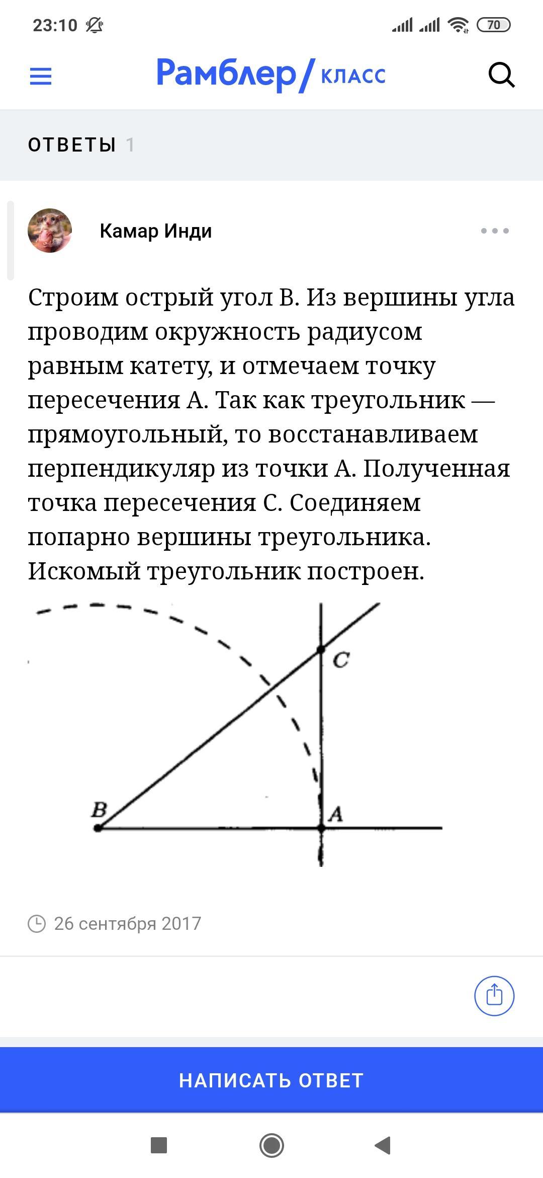 3) Постройте прямоугольный треугольник по катету и прилежащему к нему острому углу.