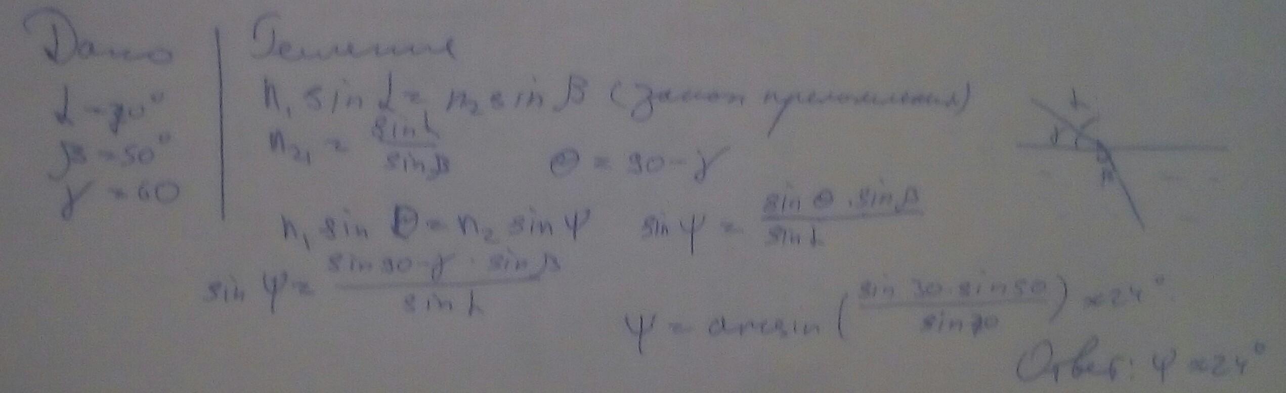 когда на поверхность прозрачной жидкости падает световой луч под углом 20 поверхности угол преломления составляет 50 градусов. Каким будет угол преломления, если угол между падающим лучом и поверхностью жидкости до 60 градусов?