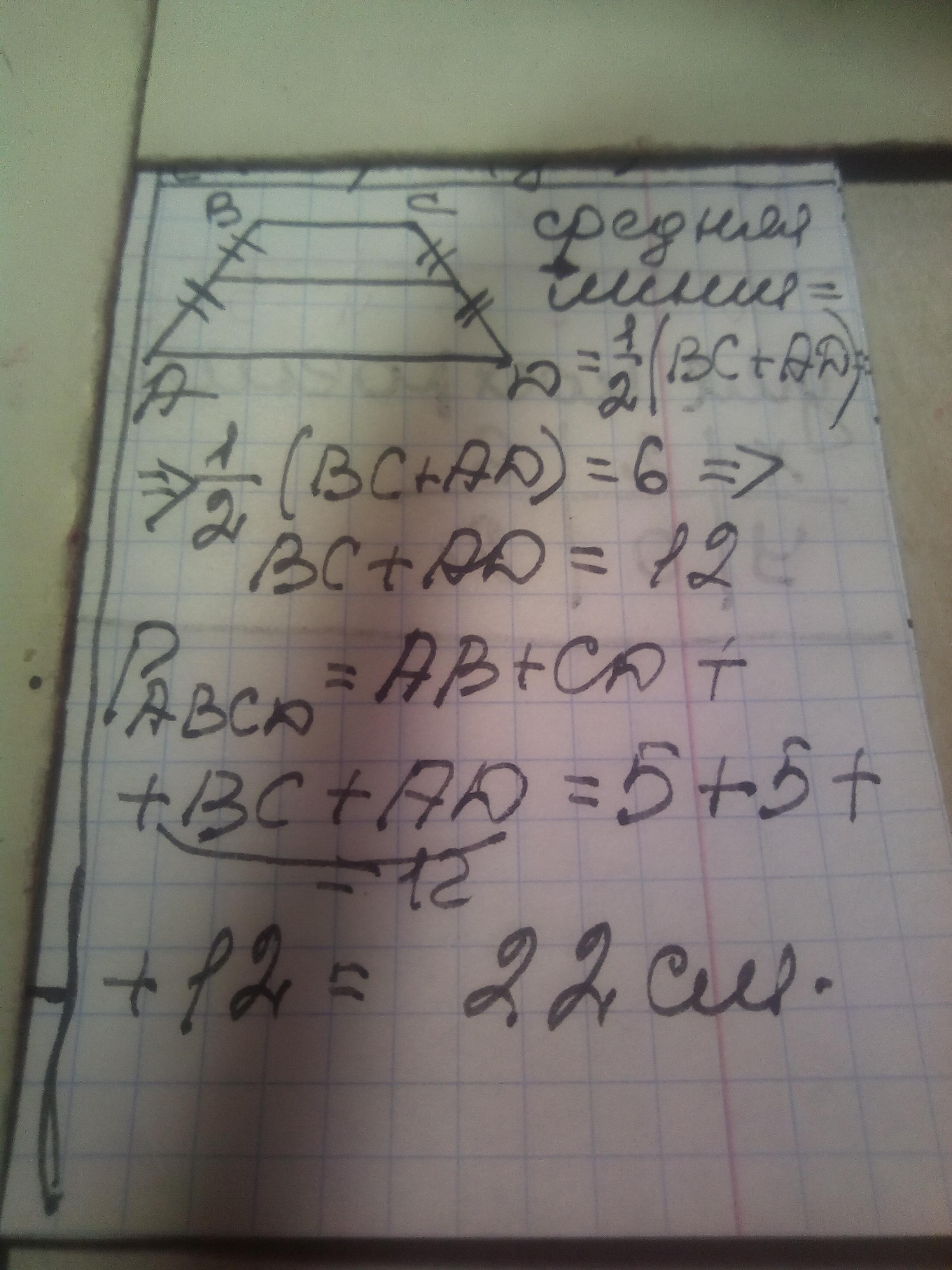 бічна сторона рівнобічної трапеції дорівнює 5см, а її середня лінія 6см. Знайдіть периметр цієї трапеції.