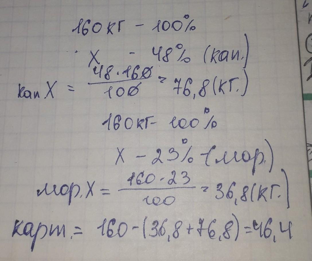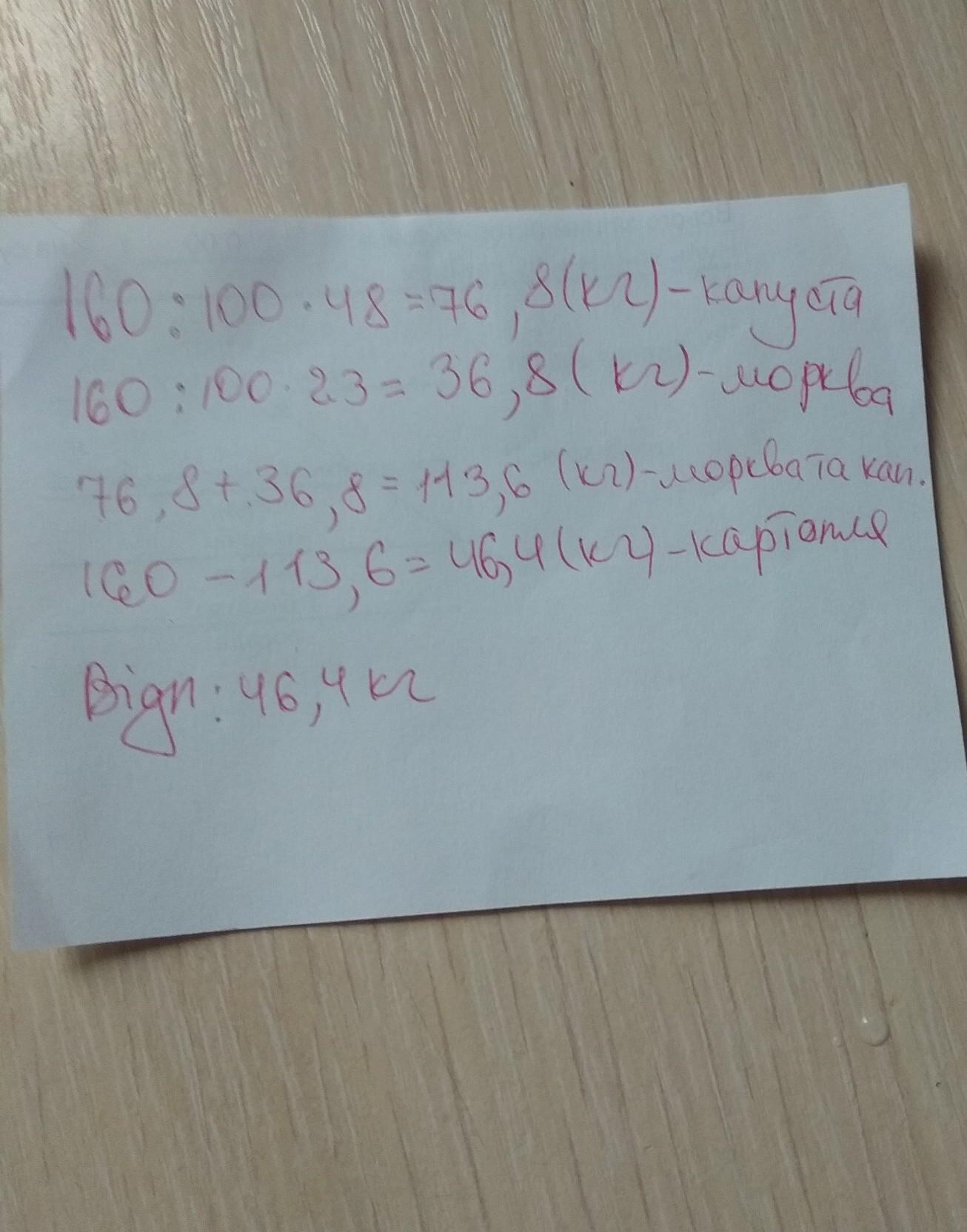 В ЇДАЛЬНЮ ЗАВЕЗЛИ 160 КГ.ОВОЧІВ.КАПУСТА СТАНОВИЛА 48% УСІХ ОВОЧІВ,МОРКВА 23%,А КАРТОПЛЯ-РЕШТА.СКІЛЬКИ КГ.КАРТОПЛІ ЗАВЕЗЛИ ДО ЇДАЛЬНІ.???