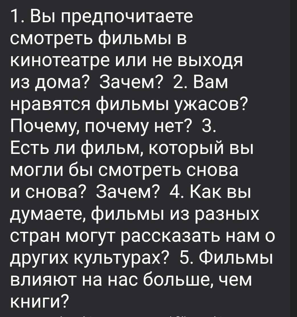 1. Do you prefer to watch movies in the cinema or in the comfort of your own home? Why?